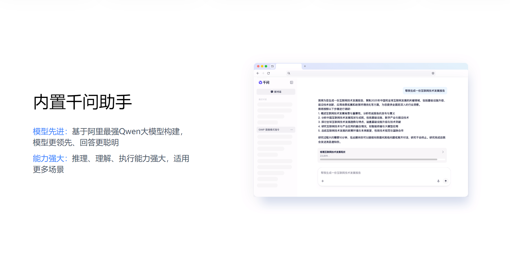 夸克AI浏览器由阿里巴巴集团旗下的夸克团队研发,是阿里“千问项目”战略的重要组成部分。其定位是超越传统浏览器的信息检索工具,致力于成为用户个人电脑端的系统级智能任务助手和AI能力核心入口。